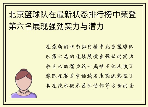 在最新的状态排行榜中,北京篮球队以第六名的佳绩展现出强劲的实力和巨大的潜力。这一成绩不仅反映了球队在赛季中的稳定表现,还彰显了其在技术、战术、团队协作等方面的全面提升。本文将从四个方面深入探讨北京篮球...