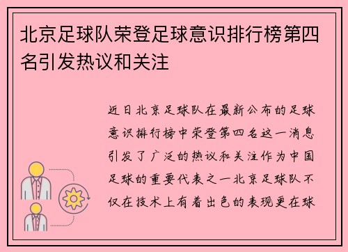 近日,北京足球队在最新公布的足球意识排行榜中荣登第四名,这一消息引发了广泛的热议和关注。作为中国足球的重要代表之一,北京足球队不仅在技术上有着出色的表现,更在球迷和社会舆论中树立了良好的形象。此事件不...