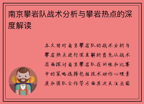 本文将对南京攀岩队的战术分析与攀岩热点进行深度解析。首先,从战术层面探讨南京攀岩队在训练和比赛中的策略选择,包括技术动作、心理素质和团队合作等方面。其次,关注当前南京地区的攀岩热点,分析其发展现状与未...